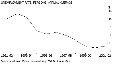 In annual average terms, growth in employment during 2001-2002 was 1.9%, compared with 1.0% in the previous year and 2.9% in 1999-2000. Recent employment growth is well below that in 1994-95, when employment rose by 4.8%. The average unemployment rate for 2001-2002 was 6.6%, 0.2 percentage points higher than the rate for the previous year. During the 1990s, the unemployment rate peaked at 10.7% in 1992-93, and after this it generally declined. Average weekly ordinary time earnings for full-time adults during 2001-2002 was $853.60, an increase of 5.5% on the comparable figure for the previous year. Movements in average weekly earnings can be affected by both changes in the level of earnings per employee and changes in the composition of the labour force. On the other hand, the wage cost index measures changes in the "price" of a fixed basket of jobs, priced to constant quality. The price of labour, as measured by the wage cost index, increased by 3.1% during 2001-02.