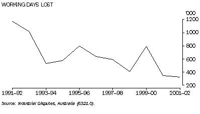 The number of working days lost due to industrial disputes was 329,300 in the 12 months to June 2002. This was the lowest number for a financial year for many decades and continues the historically low levels recorded over the last 10 years.