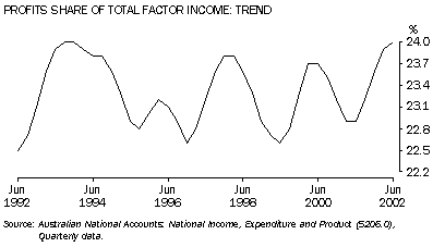 The trend ratio of compensation of employees to total factor income (the wages share) was at its lowest point in the last 10 years in the June quarter 1993, when it stood at 53.0%. By December quarter 1996 the ratio had risen to reach 55.3%, its highest level for the 1990s. The ratio in June quarter 2002 was 53.3%. Movements in the trend ratio of gross operating surplus for financial and non-financial corporations to total factor income (the profits share) tend to be inverse to the movements in the wages share as wages and corporate profits are the two major components of total factor income. The profits share recorded its highest value during the last 10 years of 24% in the September and December quarters 1993, and in the June quarter 2002.