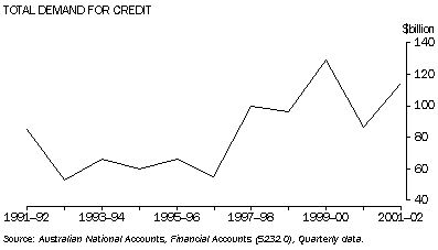 Total demand for credit by the non-financial sectors during the year ended June 2002 was $114.1b. At the end of 30 June 2002, total credit market outstandings were $1755.7b. The increase in demand for credit for the most recent four quarters has been the result of increasing demand by the household sector, increasing from $42.9b to $78.3b in loans and placements over the 12 month period ended June 2002.