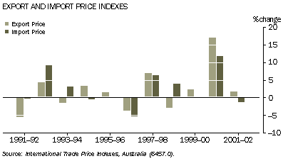 Over the past ten years movements in both the export and import price indexes have been volatile, largely reflecting variations in the value of the Australian dollar against the major trading currencies. By June quarter 2002, import prices were 23.8% above what they were ten years earlier, while over the same period export prices had increased by 25.3%. However, there were some significant short-term differences in the price behaviour for these two series over this period.