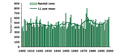 The weather and climate of the twentieth century The twentieth century began with Australia still in the grip of the Federation Drought. It witnessed several extended periods of drought and flood associated with the irregular fluctuations of the Southern Oscillation (graph C2.6), many dramatic individual weather events in all States and a gradual overall warming trend across the continent. The general features of the twentieth century climate have been described in various publications (Bureau of Meteorology 1989; Zillman 1994; Bureau of Meteorology 2001). Some of the more notable individual events and trends in Australian weather and climate over the century are described in the following pages. C2.6 Annual values of the Southern Oscillation Index (SOI), a measure of fluctuations in the surface pressure difference between Tahiti and Darwin and a useful indicator of the broadscale controls on Australian weather. Rainfall The average annual rainfall over Australia from 1900 to 1999 is shown in graph C2.7 along with an eleven year running mean. The very dry period following Federation and the above average rainfall in the 50s and 70s are clearly evident. Overall, there is a very weak rising trend in total rainfall during the century, although individual districts have experienced much stronger trends, both positive and negative, as shown in map C2.8. C2.7 Averaged annual mean rainfall (mm) over Australia, 1900-99. The solid line shows the eleven year running mean. C2.8 The spatial pattern of trends in annual mean rainfall over Australia 1900-99 in mm per century. The maps comprising figure C2.9 show the distribution of rainfall over the continent in terms of the three terciles - above average, near average and below average - for each decade in the period 1901 to 1999.