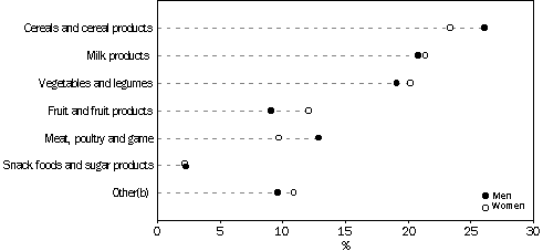 Food intake The National Health and Medical Research Council (NHMRC), in part, recommends that Australians eat a diet low in fat, in particular saturated fat; maintain a healthy body weight; limit alcohol intake; eat only a moderate amount of sugars; and eat plenty of breads, cereals, fruits and vegetables.1 Over the last twenty years there have been changes in the quantities and types of foods consumed by Australians. The consumption of meat and meat products (a main source of saturated fat) has reduced while the consumption of chicken and seafood, which are generally lower in saturated fats, has increased. The consumption of fruit and fruit products, vegetables, and grain products has increased. In addition, the amount of alcohol consumed has declined.2 Even so, the diet of many Australians is far from ideal, as indicated by the high proportion of people overweight or obese and the high incidence of related diseases. In all age groups, overweight or obese people were substantially more likely than people with a normal weight to suffer from a disease of the cardiovascular system or diabetes mellitus Type II (see Australian Social Trends 1998, Diabetes). In 1995 Australian men consumed a higher quantity of food and beverages than women in all age groups. The daily food and beverage consumption peaked at 4,240 g for men aged 19-24, and 3,320 g for women aged 25-44. Excluding beverages, cereals and cereal-based products contributed the greatest amount to the mean food intake for men (26%) and women (23%) aged over 18. These were followed by milk products (21% for both men and women) and vegetables and legumes (19% for men and 20% for women). The daily intake of fruit and fruit products increased with age, while daily intake of cereals and cereal-based products, milk and milk products, and meat, poultry and game decreased with age. Non-alcoholic and alcoholic beverages accounted for over 62% of total food and beverage intake by weight (2,460 g for men and 2,020 g for women). The contribution by weight of beverages to the total weight of food is influenced by climate. The Northern Territory had the highest contribution (74% for men) and the Australian Capital Territory had the lowest (58% for men). The average contribution of alcoholic beverages to food and beverage intake was 10% for men and 3% for women. For men, this contribution increased from 8% for those aged 19-24 to 11% for those aged 45-64 and then declined to 9% for men aged over 65. For women the contribution of alcohol to food and beverages peaked at a younger age, 4% for those aged 19-24, and then declined to 2% for those aged over 65.