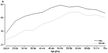 Exercise Regular physical exercise is also an essential factor when determining whether or not a person has an excess energy intake. Contrary to the Australian image as active outdoor sports-oriented people, many Australians have a sedentary lifestyle. Men and women were equally likely to have exercised (66% for men and 65% for women) but men were more likely to have exercised at a higher level (exercise that caused perspiration or a large increase in heart rate, 18% compared to 11%). 30% of men and 38% of women had exercised at a low level (leisurely walk). The proportion of people who had exercised also decreased with age. Of those aged 19-24, 74% had exercised, but this gradually declined to 57% of those aged over 64. People who were within a normal weight range were slightly more likely to have exercised than those who were overweight or obese (70% compared to 65%) and to have exercised at a higher level. Of those within a normal weight range, 34% had exercised at a low level, 19% at a medium level and 16% at a high level. In comparison, 34% of those who were overweight or obese had exercised at a low level, 16% at a medium level and 14% at a high level.