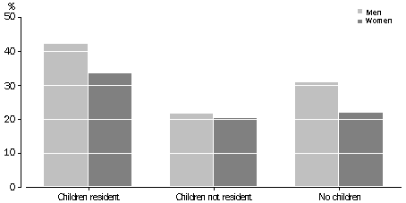 (b) Includes those for whom place of residence could not be determined. Source: Survey of Families in Australia (unpublished data). Children After separation or divorce women who remained unpartnered were more than twice as likely as men who remained unpartnered to have children living with them, 62% compared to 25%. Of those who had children living with them, just over three-quarters were women. While the women were equally as likely as the men to stay in the previous marital home overall, the presence of children gave rise to different patterns. Separated and divorced people who had children living with them were more likely to live in the family home than those who had no children or whose children were not living with them. 42% of men who had children living with them lived in the previous marital home compared to 33% of women. Being a non-custodial parent may also impact on housing needs. As people not living with their children they have different housing needs from lone parents. However, they may still need to accommodate the child(ren) when they visit. 58% of separated or divorced men had children who were not living with them compared to 27% of women. SEPARATED AND DIVORCED PEOPLE, 1992