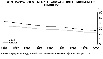 In August 2000, 25% of employees aged 15 years and over were trade union members in connection with their main job (table 6.52).