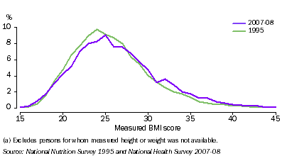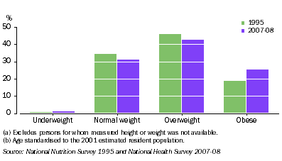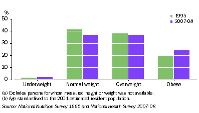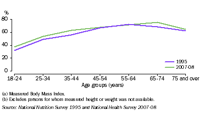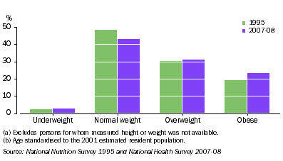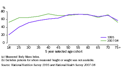 Changes over time After adjusting for age, around 61% of adults aged 18 years and over were either overweight or obese in 2007-08, up four percentage points from 57% in 1995. Proportionally, fewer adults were normal weight or overweight in 2007-08 than in 1995, but the greatest increase was in the obese category with the proportion of obese adults rising from 19% to 24%. That is, the population is gaining weight faster with more adults in the obese category of BMI. In this period, the proportion of normal weight adults decreased from 41% to 37%, while the proportion of overweight adults decreased from 38% to 37%. In 2007-08, there were just as many people overweight as there were people of normal weight (Graph 3.2). Men were gaining weight at a greater rate than women over this time, with the proportion of obese men rising from 19% to 25%, compared with a rise from 19% to 23% for women (Graphs 3.3 and 3.4). In general, the prevalence of overweight and obesity increases with age (Graph 3.5). In 2007-08, around 37% of young adults aged 18-24 years were overweight or obese compared with 75% of people aged 65-74 years. The weight gain as people age can be seen by analysing age 'cohorts'. For example, if people aged 18 years in 1995 and people aged 30-31 years in 2007-08 are treated as representative of the same group of people (having aged 12-13 years), the shift into the overweight and obese BMI categories is evident. In 1995, 21% of 18 year olds were overweight or obese. By 2007-08, over 50% of this cohort (now aged 30 or 31 years) were overweight or obese (Graph 3.6). With Australia's ageing population, the increasing number of older and overweight or obese Australians has implications for future health care resources and the national health budget.