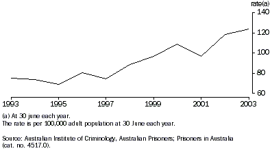 Some of the factors that have influenced the size of the prison population in the past ten years include legislative changes affecting the length of the time prisoners spend in prison; the abolition of a sentence-reducing mechanism such as remission; significant court delays leading to an increase in unsentenced prisoners in some jurisdictions; and an increase in recorded crime. The graph that follows is a time series of the rate of adult prisoners per 100,000 adult population. The rate of imprisonment has fluctuated since 1993.