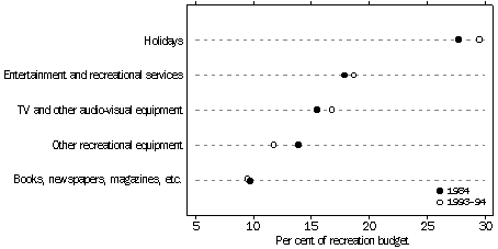 Source: Household Expenditure Survey, Australia: Household Characteristics (cat. no. 6531.0). Little change in recreation spending patterns Although Australian households are spending more on recreation overall, there has been little change in recreation spending patterns. In 1993-94, the three main areas of recreation expenditure were: holidays (accounting for 30% of the total recreation budget); entertainment and recreational services (19%); and TV and other audio-visual equipment (17%). Between 1984 and 1993-94, there appears to have been a small increase in the proportion of the household recreation budget spent in these three areas and a slight decline in the proportion spent on other recreational equipment, and on reading material. In 1993-94 households spent 12% of their recreation budget on recreational equipment such as sporting goods, toys, musical instruments and photographic equipment, and 10% on reading material such as books, magazines and newspapers. Young adult only households spent more of their recreation budget on TV and other audio-visual equipment than most other households and less on reading material such as books, magazines and newspapers. On the other hand, older adult only households (reference person aged 55 years or older) spent less of their recreation budget on TV and other audio-visual equipment than most other households and more on reading material. These households also spent a bigger portion of their recreation budget on holidays than most other households and less on entertainment, recreational services and recreational equipment. Families with young children spent more of their recreation budget on recreational equipment such as sporting goods, hobbies, toys and games than most other households and less on holidays. RECREATION SPENDING PATTERNS Source: Household Expenditure Survey: Australia: Detailed Expenditure Items (cat. no. 6535.0). HOUSEHOLD CHARACTERISTICS AND RECREATION SPENDING PATTERNS, 1993-94