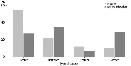 (b) Some principal applicants gave more than one reason for moving. Therefore, components do not add to total. Source: Department of Immigration and Multicultural Affairs, unpublished data, Longitudinal Survey of Immigrants to Australia. Housing tenure Over half (54%) of all recent migrating units were renting their accommodation at the time of interview (3 to 6 months after arriving in Australia). The vast majority were renting from private landlords. Fewer than 4% of all recent migrating units were renting public housing in Australia compared to 8% before migrating. Those in the humanitarian group were the most likely to be renting public housing in Australia (7%). Recent immigrants were much more likely to be renting and much less likely to own their accommodation in Australia than they had been before migrating. This was particularly true for those in the humanitarian group, many of whom may have experienced social and economic disruption in their home countries prior to migration, and therefore arrived in Australia with very few assets. Of all recent migrating units, 11% were either paying off a mortgage or owned their homes outright 3 to 6 months after arriving in Australia. Those in the business/employer nomination group were the most likely to own their homes in Australia (29%) and to have owned their previous homes before migrating (62%). While 35% of those in the humanitarian group had owned their homes in their former home countries, very few were in a position to buy in Australia. A third of all recent migrating units were either boarding or living rent free with others (mainly relatives) 3 to 6 months after arriving in Australia. Immigrants in the family and humanitarian categories were the most likely to be living with relatives (34% and 25% respectively). The proportion of recent immigrants living with others rent free was higher before migration (35%) than after arrival in Australia (22%). This could be because there were fewer family members and friends in Australia to offer support.1 On the other hand, for many immigrants, living rent free with relatives or friends before migration may have been a relatively short transition period between selling or giving up the lease on their former home and moving to Australia. Many of these migrating units could have been in a position to rent or buy their own home within 3 to 6 months of their arrival.