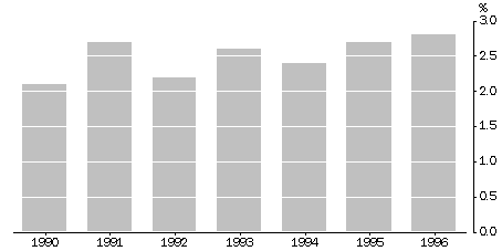 Levels and trends The last National Crime and Safety Survey conducted in 1993 found that 2.5% of all persons aged 15 years and over had experienced an assault in the 12 months prior to the survey. This was lower than the rate (3.4%) recorded in 1983. This decrease cannot be taken at face value, however, as changes in survey methods may have accounted for some of the change. Annual crime victims surveys conducted in New South Wales between 1990 and 1996 show that assault rates have fluctuated between 2.1% and 2.8% over the period. Assault rates recorded in 1996 were, nevertheless, higher than those recorded at the beginning of the decade. ASSAULT RATES BY AGE, 1993 Source: National Crime and Safety Survey (unpublished data). Groups at risk Of all assault victims identified in the 1993 survey, almost two thirds (64%) were men and almost seven in ten (69%) were aged between 15 and 34. Only a small proportion of victims (4%) were aged 55 and over. Youths aged 15-19 were the group most at risk. 8% of men and 4% of women in this age group had experienced an assault in the previous 12 months. The likelihood of being a victim decreased with age and, across all age groups, was lower for women than men. Nevertheless, the likelihood of women aged 15-19 being assaulted was higher than for men aged 25-34. Just as there were large differences in assault rates among people in different age groups, there were also differences between individuals depending on their marital status and their labour force status. Married and employed people were less likely to be victims of assault than those who had never married or those who were unemployed. Even after standardising for age effects, major differences between marital status groups and labour force status groups are apparent. Among people aged 20 years and over, married men and women had the lowest age-standardised assault rates of all marital status groups. However, it should be noted that incidents of domestic violence may have been under-reported in the survey because the questionnaire (a mail-back, self- completion form) could not necessarily be answered without the offender being aware of the responses. In comparison, separated and divorced people of either sex were more vulnerable to assault than their married or never married counterparts. Violent disputes between ex-partners following separation may account for the high rates among separated and divorced people3. However, other lifestyle factors are likely to be important in explaining why separated and divorced men had the highest rates of assault. Unemployed people of either sex were more likely to be victims of assault than either employed people or those not in the labour force. The age-standardised rate for unemployed males was 26% higher than those for men not in the labour force and 61% higher than those for men with work. The age-standardised rate for unemployed women was 58% higher than those for employed women, but there was little difference between women with jobs and those who were not in the labour force. AGE-STANDARDISED DEATH RATES(a) BY MARITAL STATUS(b), 1993 (a) Rate per 10,000 of the population. (b) Refers to people aged 20 years and over.