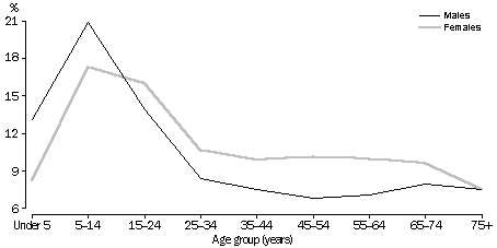 (a) Aged under 15 years. (b) Aged 18 years and over. Prevalence rates have been age standardised to the total population (aged 18 years and over) at 30 June 1995. Source: 1995 National Health Survey: Asthma and other Respiratory Conditions, Australia (cat. no. 4373.0). Treatment of asthma Asthma can be controlled with preventive medications and strategies to reduce airway inflammation.1 In 1995, an estimated 1.1 million people (55% of all people with asthma) reported using medication for their asthma during the two weeks before interview. The proportion using medication increased steadily with age, from 49% of 0-14 year olds to 68% of those aged 65 years and over. While children were less likely than other age groups to have used medication for their asthma, they were more likely to have seen a doctor. In 1995, 7% of 0-14 year olds with asthma had seen a doctor about it in the previous two weeks. Among adults, the proportion who consulted a doctor increased steadily with age, from 2% of 15-24 year olds to 6% of those aged 65 years and over. Even with careful management, acute attacks of asthma cannot always be prevented and severe attacks may require treatment in hospital. The 1995 NHS estimated that 1% of children with asthma (6,400) had visited hospital casualty, emergency or outpatients units for asthma treatment during the two weeks before interview. Hospital statistics compiled by the Australian Institute of Health and Welfare4 show that asthma is the most common medical condition for which children are admitted to hospital. For the year 1996-97, hospitals in Australia recorded asthma as the primary reason for 62,000 inpatient episodes, half of which related to children under 15 years of age. Asthma was the primary reason for 10% of all hospital inpatient episodes among 1-4 year olds and 5% among 5-14 year olds. PEOPLE WHO TOOK RECENT(a) HEALTH-RELATED ACTIONS BECAUSE OF THEIR ASTHMA, 1995