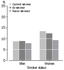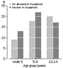 Smoking and asthma A recent report3 by the National Health and Medical Research Council (NHMRC) found that passive smoking is firmly linked, as a likely causal factor, to a range of health problems including lower respiratory tract disease and asthma in children. The NHMRC estimates that children exposed to environmental tobacco smoke are about 1.4 times as likely to suffer from asthma as children who are not exposed, and that around 8% of childhood asthma cases are attributable to passive smoking. The 1995 NHS found that prevalence of asthma was higher (about 4 percentage points) among young children living in households with one or more smokers than in households with no smokers present. Among 10-14 year olds, however, prevalence of asthma was lower in households with smokers present. The Survey did not collect any information about whether children had ever been exposed to household smoking in the past, or whether they were currently exposed to smoking outside the home. The 1995 NHS also found that asthma prevalence was higher among women who were either current smokers or ex-smokers than among those who had never smoked. For men, however, the relationship between asthma and smoking status appeared to be much weaker. SMOKING AND SELF-REPORTED ASTHMA PREVALENCE RATES, 1995