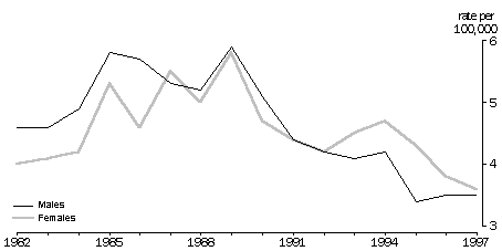 Deaths due to asthma The risk of dying from asthma is relatively low. In 1997, asthma was the underlying cause of 715 deaths which represented 5% of deaths from respiratory diseases and less than 1% of all deaths in Australia. Asthma was recorded as a contributing cause in a further 1,157 deaths. As for most other causes of death, the rate of asthma deaths increases with age. In 1997, age-specific death rates from asthma ranged from less than 1 death per 100,000 of the population aged under 35 years, to just over 22 deaths per 100,000 of the population aged 65 years and over. Age-standardised death rates from asthma (as the underlying cause of death) increased during the 1980s, peaking in 1989, but have since declined to below the 1982 rates for both males and females. Several researchers5,6,7 have found evidence to suggest that some of the increase in asthma death rates during the 1980s may have been due to diagnostic transfer, resulting in overstatement of asthma deaths, particularly among older people. Diagnostic transfer refers to a tendency to diagnose one condition rather than another owing to similarities in symptoms and changing recognition of diseases. Endnotes 1 Jenkins, C.R. and Woolcock, A.J. 1997, ‘Asthma in adults’, Medical Journal of Australia, vol. 167, pp. 160-165. 2 Sporik, R., Holgate, S., Platt-Mills, T., Cogswell, J. 1990, ‘Exposure to house dust mite allergen (Der p1) and the development of asthma in childhood. A prospective study’, New England Journal of Medicine, vol. 323, pp. 502-507 3 National Health and Medical Research Council 1997, The health effects of passive smoking, A scientific information paper, AGPS, Canberra. 4 Australian Institute of Health and Welfare 1998, Australian Hospital Statistics 1996-97, AIHW, Canberra. 5 Jenkins, M.A., Rubinfeld, A., Robertson, C.F., Bowes, G. 1992, ‘Accuracy of asthma death statistics in Australia’, Australian Journal of Public Health, vol. 16, no. 4, pp. 427-429. 6 Campbell, D.A., McLennan, G., Coates, J.R., Frith, P.A., Gluyas, P.A., Latimer, K.M., Martin, A.J., Roder, D.M., Ruffin, R.E., Yellowlees, P.M. 1992, ‘Accuracy of asthma statistics from death certificates in South Australia’, Medical Journal of Australia, vol. 156, pp. 860-863. 7 National Health and Medical Research Council 1988, Asthma in Australia; Strategies for reducing morbidity and mortality, Report of the NHMRC Working Party on Asthma Associated Deaths, Canberra.