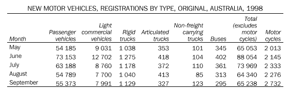 New Motor Vehicle Registrations New Motor Vehicle Registrations Contact Manager New Motor Vehicle Registrations Australian Bureau of Statistics GPO Box 9817 BRISBANE QLD 4001 Telephone: Brisbane 07 3222 6180 Facsimile: Brisbane 07 3222 6284 Email: client.services@abs.gov.au Internet: www.abs.gov.au Purpose To provide estimates of new motor vehicle registrations. Description New Motor Vehicle Registrations (NMVR) is a monthly collection of the number of new vehicles registered for the first time for normal road use. It is used as a proxy for sales of new vehicles and considered to be a main economic indicator. Data are obtained from State and Territory motor vehicle registration authorities and reflect information contained in registration documents. Data Detail Original, seasonally adjusted and trend estimates of motor vehicle registrations by: Other characteristics of vehicles which are not published but available on request include: Geographic Coverage Australia, States and Territories, and residential post code of owner. Frequency of Data Availability Data are released monthly. Historical Data Published data are available from 1960. More detailed unpublished data are available from July 1993. Products and Services Publications New Motor Vehicle Registrations, Australia, Preliminary (9301.0) Other Special data services are available on request. Example of Information Available