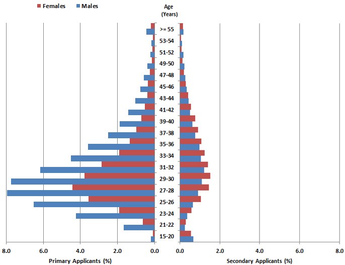 Source: QuickStats Country of Birth, India, Census of Population and Housing, 2011, Australian Bureau of Statistics Nearly three quarters (73%) of Indian taxpayers arrived after 2005. Their numbers peaked in 2008 and 2009 with most holding a Skill or Provisional visa. Graph 16: Migrant Taxpayers Born in India, Number of migrant taxpayers, By Year of arrival and visa stream, 2011-12 Source(s): Personal Income Tax and Migrants Integrated Dataset (PITMID), 2011-12 (cat. no. 3418.0) Who are the Indian-born taxpayers? Almost half of Indian-born taxpayers were primary applicants and most were males. By contrast, there were more female secondary applicants than males. Graph 17: Migrant Taxpayers Born in India, Proportion of migrant taxpayers, By Applicant status and Sex, 2011-12 Almost two-thirds of Indian taxpayers were males with a Skill visa. Almost 40% were males aged 25-34 years old. Indian males reported higher median Employee income than Indian females for all age groups. Graph 18: Migrant Taxpayers Born in India With a Skill Stream Visa, Median Employee income, By Age group (years) and Sex, 2011-12 Source(s): Personal Income Tax and Migrants Integrated Dataset (PITMID), 2011-12 (cat. no. 3418.0) How much personal income did Indian taxpayers generate in 2011-12? In 2011-12 there were 147,642 (15%) Indian taxpayers, a 10% increase on 2010-11. The United Kingdom had the highest proportion of taxpayers at 16%. Indian migrant taxpayers generated $7.9 billion in total income in 2011-12. Most (94%) of the income was Employee income ($7.4 billion). Their median Employee income increased 7.8% in real terms from $42,780 in 2010-11 to $46,104 in 2011-12. This was the second only to Chinese median Employee income (increased 8.2%). Indian taxpayers reported $387 million in Business income, or 14% of the total Business income reported by migrant taxpayers. Their median Business income increased 9.5% in real terms from $8,618 in 2010-11 to $9,440 in 2011-12. Indian taxpayers also reported $73 million in Investment income (4.6% of total Investment Income reported by migrant taxpayers) and $15 million in Other income (3.5% of total Other income reported by migrant taxpayers). Graph 19A: Migrant Taxpayers, Proportion of persons reporting income, By selected Country of birth and Source of income, 2011-12 Footnote(s): (a) Includes Superannuation and annuities income. (b) Includes Channel Islands and the Isle of Man. (c) Excludes Special Administrative Regions (SARs) and Taiwan. Source(s): Personal Income Tax and Migrants Integrated Dataset (PITMID), 2011-12 (cat. no. 3418.0) Graph 19B: Migrant Taxpayers, Proportion of reported income, By selected Country of birth and Source of income, 2011-12 Footnote(s): (a) Includes Superannuation and annuities income. (b) Includes Channel Islands and the Isle of Man. (c) Excludes Special Administrative Regions (SARs) and Taiwan. Source(s): Personal Income Tax and Migrants Integrated Dataset (PITMID), 2011-12 (cat. no. 3418.0) Employee incomes and skill levels for Indian migrants improve over time Potential permanent and temporary skilled migrants can nominate for a variety of occupations to gain entry under the Skilled Migration Programme to Australia. Table 6 shows the main occupations for Skilled Indian nationals in 2011-12 (DIBP, 2014). Table 6: Number of Indian nationals, By main occupation for Points Tested Skilled Migration outcomes, 2011-12