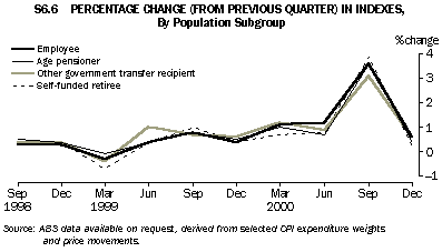 Between the December quarters 1999 and 2000 the increases in the population subgroup indexes ranged from 5.6% for Self-funded retiree households to 6.6% for Employee households. The increase in the CPI over the same period was 5.8%.