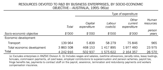 Research and Experimental Development, Survey of Data are available for the manufacture of motor vehicles and parts, transport equipment and for transport as an economic objective. Detailed data on the transport industries are not published but are available on request. Geographic Coverage Australia. Frequency of Data Availability Data are released annually and biennially. Historical Data The Business Enterprises, General Government, Private Non-Profit, and Higher Education Organisations surveys were first conducted by the ABS in 1976-77, 1978-79, 1978-79 and 1978, respectively. Products and Services Publications Research and Experimental Development, Business Enterprises, Australia (cat. no. 8104.0) Research and Experimental Development, General Government and Private Non-Profit Organisations, Australia (cat. no. 8109.0) Research and Experimental Development, Higher Education Organisations, Australia (cat. no. 8111.0) Research and Experimental Development, All Sector Summary, Australia (cat. no. 8112.0) Example of Information Available