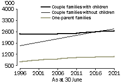Families Over the next 20 years, couple families without children are projected to become the most common of all family types, overtaking couple families with children in 2016 and comprising 42% of families in 2021. This is mainly associated with the ageing of the population, and the fact that by 2021, the large cohort of post-war “baby-boomers” will have entered old age and will no longer have their children residing with them. In addition, a growing number of couples are choosing to remain childless at younger ages. The work and family roles of women have changed substantially over the last 20 to 30 years, with increasing numbers participating in higher education and the labour force. As a consequence, women are having children later in life (see Australian Social Trends 2001, Older mothers), or not at all. Accordingly, while the number of couple families with children is projected to remain much the same between 1996 and 2021 (around 2.5 million), as a proportion of all families they are projected to decline, from 49% to 40%. The future composition of families is likely to be influenced not only by increasing numbers of couples without children, but also by increasing numbers of divorced people in the population. One-parent families are projected to increase from about 742,000 in 1996 to about 1.1 million in 2021, comprising 16% of all families in 2021. This increase will inevitably affect the living arrangements of children. While living with both parents will continue to be the most common living arrangement for children aged 0-14 years, the proportion of 0-14 year olds in one-parent families is projected to increase, from 17% in 1996 to 22% in 2021. PROJECTED NUMBER OF FAMILIES BY FAMILY TYPE