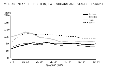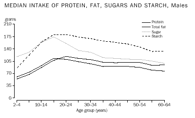 The patterns in intake of individual macronutrients differed with age and sex. Young children and adolescents consumed slightly more fat than protein, the reverse of the pattern for males aged 19 years and over and females 16 years and over. Similarly, children and adolescents consumed more sugars than starch whereas adults ate more starch than sugars. Carbohydrates contributed the largest proportion of energy intake for all age groups. It contributed over 50% to the total energy intake of those aged under 19 years, reducing to 45% for adults aged 45-64 years. Fat contributed about one-third to all age groups. Protein contributed about 14% for children under 15 years, increasing to 17% for adults over 45 years. These proportions were similar for both males and females. Adults who consumed alcohol obtained approximately 4-9% of their energy intake from alcohol. (Table 4.) The proportion of total energy provided by saturated fat and sugars decreased with age, and the proportion provided by protein increased with age. The proportion provided by other macronutrients did not differ significantly with age. Vitamins and minerals As with macronutrients, males consumed larger quantities of vitamins and minerals than females. For males, median intakes generally peaked at 16-24 years although for some vitamins and minerals the median intake was higher in older ages (e.g. vitamin C). For females, the highest median intakes for the majority of vitamins and minerals were by women aged 45-64 years. (Table 6.) Vitamin and mineral intakes have also been expressed in relation to energy intake. This provides an indication of the 'richness' of the diet, relative to the total amount of energy consumed. In contrast to actual intake of vitamins and minerals, adult females generally consumed higher amounts per 1,000 kJ of energy than adult males. However, men and women had similar intakes per 1,000 kJ of energy for thiamine, riboflavin and zinc. Females aged 2-15 years also generally consumed similar or larger amounts of vitamins and minerals per 1,000 kJ of energy than males, except for calcium and preformed vitamin A. (Table 8.) People aged 45 years and over usually had the highest vitamin and mineral intakes per 1,000 kJ of energy. However, 2-3 year olds had the highest intakes of calcium and preformed vitamin A per 1,000 kJ of energy, because of their high intake of milk and milk products. Thiamine and riboflavin were relatively stable across age groups. OTHER FACTORS AFFECTING NUTRIENT INTAKE BY ADULTS State and Territory Differences in adult nutrient intake across States and Territories were generally small. Median energy intake was highest in South Australia for men and in the Australian Capital Territory for women. It was lowest in Queensland for men and in Tasmania for women. Women in the Australia Capital Territory consumed larger amounts of most macronutrients than other females. Western Australian men consumed the largest amounts of carbohydrates and South Australian men consumed the largest amounts of fats. (Table 10.) Geographic region was classified as metropolitan, rural centres, and rural and remote areas. Median nutrient intake by adults varied across geographic areas. (Tables 14 and 16.) Some illustrations include: