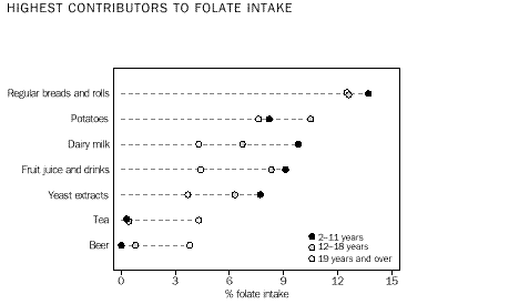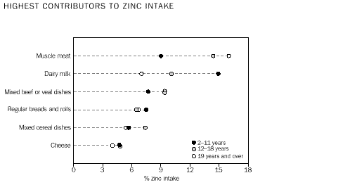 Dietary fibre Fibre attracts and absorbs water and helps to prevent constipation. Its effects on health are still incompletely understood but some components have a role in lowering blood cholesterol, while others help in controlling blood glucose and in protecting against the development of a number of intestinal problems. Foods of animal origin do not contain dietary fibre. Approximately 80% of dietary fibre came from cereal products, cereal-based products, fruit and vegetables. The major sources of dietary fibre were: regular breads and rolls for all ages; and potatoes for adolescents. Potatoes contributed a moderate amount to intake by children and adults. Other foods that contributed a moderate amount to dietary fibre intake were pome fruit, single source breakfast cereals, mixed source breakfast cereals and mixed dishes where cereals are the major ingredient. (Table 48.) Vitamin A Vitamin A is a fat soluble vitamin required for cell differentiation, growth and vision. Both preformed vitamin A (retinol) and provitamin A (carotenoids) contribute to the total vitamin A content, which is expressed as retinol equivalents. The major sources of preformed vitamin A were dairy milk and margarine for all ages, and organ meats and offal for adolescents and adults. (The contribution of organ meats and offal reflects its high level of preformed vitamin A, as only 1.6% of adults consumed these foods.) Foods contributing a moderate amount to preformed vitamin A were: cheese for all ages; frozen milk products and mixed source breakfast cereals for children and adolescents; and dairy fats (e.g. butter) for adults. (Table 51.) Carrots and similar root vegetables provided over 40% of provitamin A intake irrespective of age or sex. Other fruiting vegetables were a major source in adolescents and adults and a moderate source in children. Other moderate contributors were fruit and vegetable juices and drinks for children and adolescents, and soup for adults. (Table 52.) Folate Folate is a water soluble B vitamin which plays an essential role in metabolism and in the division of all body cells including those in blood. Survey estimates of folate intake are based on the natural folate content of foods and beverages and do not include additional folate from food and beverages fortified with folate. Cereal products, vegetables and milk products provided approximately 55% of folate intake for all ages. Adults obtained a higher proportion of folate from vegetable products and less from milk products than children and adolescents. Regular breads and rolls provided 12-14% of folate consumed. Moderate sources of folate included potatoes, dairy milk, fruit/vegetable juices and drinks and yeast extracts for all ages. In addition, tea made a moderate contribution to women's folate intake as did beer to men's intake. (Table 56.) Calcium Calcium is a major component of bones and teeth. Approximately 50-66% of calcium intakes was provided by milk products, with 30-45% from dairy milk, about 10% from cheese and about 5% from frozen milk products. The contribution of most milk products was higher for children aged 2-11 years except for cheese. Regular breads and rolls and mixed cereal dishes also made a moderate contribution. (Table 58.) Iron Iron is essential because of its role in oxygen and electron transport. Animal sources of iron are better absorbed than those from plant food. The presence of vitamin C or animal protein enhances the availability of iron derived from plant foods. Approximately 55% of iron intake was provided by cereal products and meat products, with cereal-based products and vegetable products contributing an additional 20%. Cereal products made a larger contribution to children's iron intake than to adolescents' and adults' intake, and the reverse applied to meat products. (Table 61.) The major sources of iron intake were: regular breads and rolls for all ages; single source breakfast cereals for children and males aged 12-18 years; and mixed source breakfast cereals for all ages. Moderate sources of iron intake for all ages were mixed dishes where cereal is the major ingredient, potatoes, muscle meat and mixed dishes where beef or veal is the major ingredient. In addition, single source breakfast cereals were a moderate source of iron intake for adult males and females aged 12 years and over, as was tea for adults. Zinc Zinc has a major role in protein and carbohydrate metabolism and is needed for many different functions, including growth, sexual maturation and wound healing. The major sources of zinc intake were: dairy milk for children and adolescent males; and muscle meat for adolescents and adults. Dairy milk made a moderate contribution for intake by adults and adolescent females, as did muscle meat for children. Moderate sources of zinc intake for all people aged two years and older were regular breads and rolls, mixed dishes where cereal is the major ingredient and mixed dishes where beef or veal is the major ingredient. (Table 61.) Tables 1-63 contain information based on a 24-hour recall period. Tables 64-89 contain information adjusted using data for a second 24-hour recall period collected from a small sub-sample of respondents. Information on percentile distributions of nutrient intake, adjusted for within-person variation, provides a better indication of the 'usual' range of intake in the population. Adjustments were made to all nutrients except alcohol. See paragraphs 27-35 of the Explanatory Notes for more information on the adjustments. The percentile distributions of adjusted nutrient intake describe the range of nutrient intake between the 10th and 90th percentiles. The range of intake was widely dispersed for calcium, riboflavin, vitamin C, provitamin A and total vitamin A expressed as retinol equivalents. The intake range was less dispersed for the other nutrients, that is the 10th percentile was up to 50% less than median intake and the 90th percentile was up to 70% more th