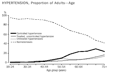 PHYSICAL MEASUREMENTS With participants' written consent, the blood pressure (of those aged 16 years and over), height, weight, and waist and hip circumferences were measured by trained interviewers (see paragraphs 16-18 of the Explanatory Notes). Pregnant women were excluded from this component of the survey. Height Males were generally taller than females at all ages. While boys aged under 12 years had a similar mean height to girls in this age group, males aged 12 years and over were much taller than females in every age group. Height increased rapidly during childhood. Average height increased from 96 cm for both girls and boys aged 2-3 years until the age of 19-24 for males (178 cm) and 16-18 years for females ( 164 cm). Average height then decreased with age to 170 cm for men aged 65 years and over and 157 cm for women aged 65 years and over. The decrease in average height with age in adults is largely due to two factors: a general trend over time for new generations to be taller than previous generations; and a loss of height by individual adults as part of the ageing process. (Table 90.) Weight On average, males were heavier than females. Mean weight was approximately the same for boys and girls aged under 12 years but was higher for males than females in all other age groups. This is the same pattern as was evident for height. Average weight was greatest in men and women aged 45-64 years, in contrast with the peak in height for 16-24 year olds. This ongoing weight gain, after maximum height is reached, is possibly due to factors such as exercise and diet. (Table 90.) Overweight and obesity Indicators of underweight, overweight and obesity vary with age, although all indicators are based on weight in relation to height. For adults, BMI was derived. Adult BMI categories are, however, inappropriate for children and adolescents as both weight and height are age and sex dependent. Consequently, 'weight for height' has been derived for children aged 2-8 years (see the Glossary) and 'BMI for age' has been derived for people aged 9-18 years. Comparisons across all age groups should be made with care because of the different indicators used. Weight for height indicates whether a child is thin/wasted or overweight compared with others of the same sex and height, based on comparison with an international reference population (see Explanatory Notes and Glossary). Over 85% of children aged 2-8 years had a normal weight for height. A very small proportion of children of this age had low weight for height (thinness), and approximately 5% had a high weight for height (overweight). (Table 93.) BMI for age uses age and sex specific BMI cut-offs, based on international reference values (in contrast with the adult categories, for which the cut-offs are the same across all age and sex groups). The majority of people aged 9-18 years had a normal BMI for age (approximately 75%). A small proportion of 9-18 year olds were underweight, and about 23% were overweight or at risk of overweight. (Table 93.) Adults were classified as being underweight, acceptable, overweight or obese using the World Health Organisation's classification of BMI categories (see the Glossary for details). At every age, men were more likely than women to be overweight or obese. The proportion who were overweight or obese increased with age and peaked at 50-54 years for men and 60-64 years for women. Overall, 45% of men and 29% of women were considered to be overweight with a further 18% of both men and women being classified as obese. For people aged 45 years and over, only about 25% of men and 35% of women were within an acceptable weight range for their height. (Table 94.) Waist and hip Waist and hip circumferences were largest for men and women aged 45 years and over. On average, males aged 12 years and over had larger waists than females, whereas girls and boys aged 2-11 years were similar within each age group. The average waist circumference for persons aged 19 years and over was 94 cm for men, compared to 81 cm for women. In contrast, hip measurements were generally similar for males and females within the same age group. The average hip circumference for persons aged 19 years and over was 102 cm for men and 103 cm for women. (Table 91.) However, height, weight and waist circumference for males were larger than for females from 12 years of age. The waist to hip ratio (WHR) was calculated for people aged 19 years and over. A high WHR is generally indicative of excessive abdominal fat which is associated with an increased risk of cardiovascular disease. The mean WHR was higher for men than women (0.91 compared to 0.79) and it increased with age. WHR greater than 0.9 in men and 0.8 in women is considered to be of concern (Ball et al. 1993). The proportion of people exceeding these thresholds increased with age, with more men (55%) having a high WHR than women (36%). (Table 91.) Blood pressure was measured for respondents aged 16 years and over, with the exception of pregnant women. On average, systolic and diastolic blood pressures were slightly higher for men than women. Mean systolic blood pressure was relatively similar for people below 45 years of age (111-114 mmHg for women and 122-124 mmHg for men) and then increased with age to an average of 143 mmHg for people aged 65 years and over. Mean diastolic blood pressure increased with age and peaked at an average of 79 mmHg for people aged 45-64 years. (Table 95.) High blood pressure is an important risk factor for coronary heart disease and stroke. People with high blood pressure were classified to a hypertension category based on their systolic and diastolic blood pressure and use of blood pressure medication (see the Glossary for more information). Less than 5% of people aged 16-44 years were hypertensive, compared to 23% of people aged 45-64 years and 48% of people aged 65 years and over. (Table 95.) Document Selection These documents will be presented in a new window.