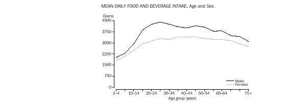 On average, males in all age groups consumed larger amounts of food and beverages than females. Males aged 25-29 years had the highest mean daily intake of food and beverages. The decrease in the mean intake of food and beverages from the age of 45-49 years was greater for males than females.
