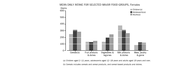 • Adolescent females and women generally had a higher mean daily intake of fruits than males of the same age. This was the reverse of the pattern for all other major food groups.