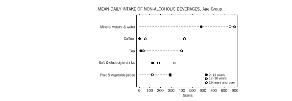 Almost every Australian had consumed one or more non-alcoholic beverages. In all age groups, a higher proportion reported drinking mineral waters and water than any other type of non-alcoholic beverage. Consumption of other non-alcoholic beverages varied by age: