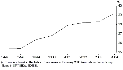 (b) There is a break in the Labour Force series in February 2000 (see Labour Force Survey Notes in STATISTICAL NOTES). Source: ABS Labour Force Australia (cat. no. 6202.0) (February, May, August, November). KNOWLEDGE WORKERS AS A PROPORTION OF EMPLOYED PERSONS(a) Source: ABS Labour Force Australia (cat. no. 6202.0) (February, May, August, November). STATISTICAL NOTES Knowledge workers Knowledge workers are defined here as those classified as managers and administrators, professionals and associate professionals in the Australian Standard Classifications of Occupations (ASCO). This definition was also used by the Department of Industry, Tourism and Resources in its publication, Australia as a Modern Economy: Some statistical indicators, 2002 and is compatible with the Asia-Pacific Economic Co-operation (APEC) definition in Towards Knowledge-based Economies in APEC, 2000. The Labour Force Framework The labour force is the most widely used measure of the economically active population, that is, the labour supply available for the production of economic goods and services in a given period. The term ‘labour force’ as defined in the international standards is associated with a particular approach to the measurement of employment and unemployment. Essentially this approach is the categorisation of persons according to their activities during a short reference period by using a specific set of priority rules. The labour force framework classifies the in-scope population into three mutually exclusive categories, at a given moment in time:employed; unemployed; and not in the labour force. The employed and unemployed categories together make up the labour force which gives a measure of the number of persons contributing to, or willing to contribute to, the supply of labour at that time. The third category (not in the labour force) represents the currently inactive population. For more information see ABS Labour Statistics: Concepts Sources and Methods, (cat. no. 6102.0). Employed Persons Employed persons include all persons aged 15 years and over who, during the reference week: worked for one hour or more for pay, profit, commission or payment in kind in a job or business, or on a farm (comprising employees, employers and own account workers); or worked for one hour or more without pay in a family business or on a farm (i.e. contributing family workers); or were employees who had a job but were not at work and were: away from work for less than four weeks up to the end of the reference week; or away from work for more than four weeks up to the end of the reference week and received pay for some or all of the four week period to the end of the reference week; or away from work as a standard work or shift arrangement; or on strike or locked out; or on workers' compensation and expected to return to their job; or were employers or own account workers, who had a job, business or farm, but were not at work. Labour Force Survey notes Labour Force Survey occupation data are classified, from August 1996, according to the Australian Standard Classification of Occupations (ASCO) Second Edition, a detailed description of which appears in Australian Standard Classification of Occupations, Second Edition (cat. no. 1220.0). As a result of changes in coding methods, estimates classified by industry, occupation and status in employment data from February 2000 onwards are not strictly comparable with earlier periods. For details on the changes to industry and occupation, in particular associate professionals, refer to the ABS Information Paper: Forthcoming Changes: Industry, Occupation and Status in Employment Data, (cat. no. 6203.0.)