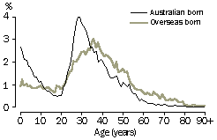 Reflecting their different mix of reasons for leaving, Australian-born emigrants tended to be younger than those born overseas. While both groups had a younger age profile than the total Australian population, Australian-born emigrants were more likely than overseas-born emigrants to be adults aged 25 to 34 years (33% compared with 22%) or to be children younger than 10 years (18% compared with 9%). The comparatively high proportion of Australian-born emigrants who were children may partly be due to the departure of families comprising overseas-born parents and their Australian-born children.