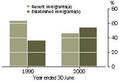 The pattern of overseas-born emigration has changed over the last ten years. In contrast to 1989-90, when most overseas-born emigrants (63%) were also recent immigrants (i.e. had lived in Australia for less than five years), the majority of those who emigrated during 1999-2000 were established immigrants (at least five years residence in Australia). Of the overseas-born who emigrated during 1999-2000, 23% had lived in Australia for less than two years, 24% for between two and four years, and 54% for between five and nine years. Very few (less than 1%) had lived in Australia for ten years and over. This implies that in 1999-2000 only a small proportion of older overseas-born emigrants departed after retiring from a long period in the Australian workforce.