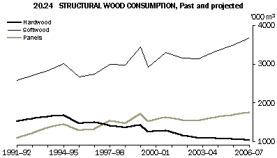 In the past decade, reduced availability of hardwood sawlogs and increased availability of softwood sawlogs and pulpwood resulted in significant changes in the relative prices of these production inputs, and consequently in the production mix of structural wood products and their prices to consumers. Sawn hardwood prices rose strongly relative to sawn softwood- and pulpwood-based products such as wood-based panels (graph 20.23). With these trends projected to continue throughout the current decade, sawn hardwood consumption is projected to decline from 1.2 million cubic metres in 2000-01 to 1.0 million cubic metres in 2006-07, while sawn softwood consumption is projected to rise from 2.9 million to 3.7 million cubic metres. Consumption of wood-based panels and reconstituted wood products is also projected to rise in the medium term, from 1.5 million cubic metres in 2000-01 to 1.7 million cubic metres in 2006-07 (graph 20.24). The projected lower rate of increase in consumption of wood-based panels and reconstituted wood products relative to that of sawn softwood reflects expectations that higher sawn softwood production will increase the availability of low-priced soft sawnwood, and that, while reconstituted structural wood products will remain competitively priced, their use will continue to be constrained to niche markets by building preferences. Structural wood production Australia produced 5.3 million cubic metres of structural wood in 2000-01, consisting of 1.2 million cubic metres of sawn hardwood, 2.3 million cubic metres of sawn softwood and 1.8 million cubic metres of wood-based panels (graph 20.25). The average recovery rate (the ratio of sawnwood produced to the volume of sawlogs milled) is estimated to be around 40% from plantation sourced softwood logs and 33% from native forest sourced hardwood logs. Production of wood-based panels includes reconstituted structural wood products that are direct substitutes for sawn timber, such as laminated veneer lumber and composite beams. If all of the sawlog component of the industrial roundwood supply projected for the period 2005-06 to 2009-10 were to be processed into sawn timber, then reduced hardwood sawlog availability from native forests could result in annual sawn hardwood production falling by around 15-20% to average 1.0 million cubic metres, and sawn softwood production rising by around 60-70% to average 4.1 million cubic metres a year. The increased supply of pulpwood directly and as mill residue could also reduce the cost of producing wood-based panels and reconstituted structural products, the combined production of which could potentially average 2.2 million cubic metres a year in the period 2005-06 to 2009-10 (see graph 20.25). Structural wood imports and exports There has been a long-term decline in the share of imports in structural wood consumption, as domestically produced sawn softwood has become more competitive with imports. At the same time, the share of wood-based panels imports in total wood-based panels consumption has been rising, reflecting the availability of low cost imported wood-based panels and reconstituted structural wood products. Future trends in Australian trade in soft sawnwood (both imports and exports) will depend largely on the international competitiveness of softwood processing in Australia. Although the share of sawn softwood imports in Australian sawn softwood consumption is expected to continue to decline, it is expected that imported special applications timbers such as Douglas fir and western red cedar will continue to hold around 10-15% of the market. In the reconstituted structural wood market, imports represent a high share of total consumption and are likely to continue to do so, as the size of the mills required for economic production of many of these products exceeds the likely requirements of Australia's relatively small domestic market. While some of the projected additional sawn softwood production (see next section) is likely to be absorbed by the domestic market (probably at lower prices), a large proportion would be available for export. However, the ability to export sawn softwood will depend on Australia's international competitiveness in Pacific Rim markets. To compete, Australian sawmillers will need to be able to produce and transport sawn softwood to export markets at a lower cost than competing nations. This may prove increasingly difficult as sawn softwood from plantations in other nations such as Argentina and New Zealand also comes on stream in the latter half of the current decade. Plantations and structural wood markets Forest plantations have provided progressively more of Australia's structural wood resources in recent years. Some recent revisions to projected wood supplies from both forest plantations and native forest, however, suggest that this process is occurring more quickly than previously expected. It is now possible that forest plantations could be providing 75% of domestic industrial wood supplies by 2010, compared with expectations of only around 62% several years ago. The forecast net increase in wood flow is also much larger than previously expected - at around 5.5 million cubic metres - after expected decreases in flows from native forest are taken into account. The potential increase in plantation wood supplies will have many implications for Australia's wood and paper industries. If all of the sawlog component of the industrial roundwood supply projected for the period 2005-06 to 2009-10 were to be processed into sawn timber, then sawn hardwood production in Australia would fall by 15-20% and sawn softwood production would rise by 60-70% relative to current levels. This would represent a significant addition to domestic sawn softwood availability. The issues relating to the potential to export the increased stock of sawn softwood that is not required for domestic consumption were discussed in the previous section. Large increases in domestic pro