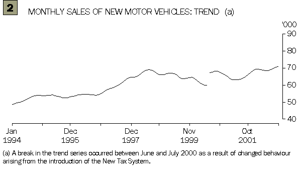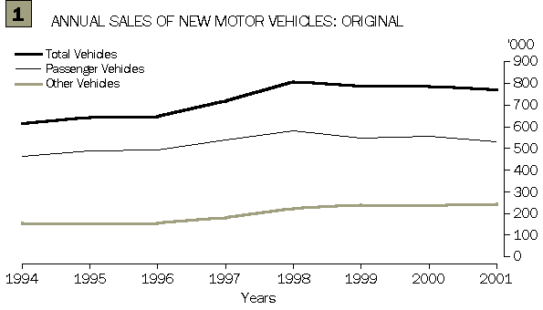 Sales of new motor vehicles rose from 616,256 in 1994, peaked at 807,669 in 1998, and subsequently declined to 772,681 in 2001. The sales decline was in the passenger vehicle category (excluding: motorcycles and four-wheel drive passenger vehicles) where sales in 2001 were 54,908 vehicles below the 1998 record high, an overall fall of 9.4%. In contrast, new sales of 'other' vehicles, (including: four-wheel drive passenger vehicles, trucks, buses, all terrain vehicles, and pick-up/cab chassis vehicles), reached a level in 2001 that was 19,920 vehicles above the level in 1998, a rise of 8.9%. The higher rate of sales growth for 'other' vehicles has led to their share of total sales rising from 25% in 1994, to 28% in 1998 and 31% in 2001.