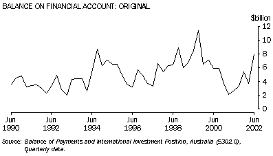 The balance on the financial account, in original terms, changes markedly from quarter to quarter. This volatility reflects, in part, the huge gross flows which underlie the balance on financial account and the difficulties associated with recording them in the correct time period. This in turn, is reflected in the volatility and size of the net errors and omissions item. As Australia usually has a current account deficit, the balance on the financial account usually records a surplus (or net inflow).