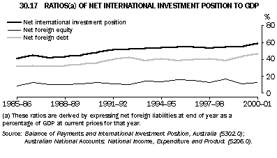 Graph 30.17 shows that the ratio of Australia's net foreign liabilities (Australia's net international investment position) to GDP has been rising for most years since 30 June 1988 and reached its highest level of nearly 59% at 30 June 2001. The ratio of net foreign debt to GDP was 46.4% at 30 June 2001, up strongly on the results for recent years. The ratio of net foreign equity to GDP was 12.4% at 30 June 2001, up on the ratio at 30 June 2000, but still below the average for the last ten years (13.4%).