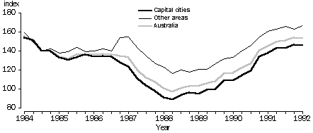 HOUSING AFFORDABILITY INDEX, 1993 Source: Commonwealth Bank and Housing Industry Association Housing Report HOUSE PRICES(a), 1993 (a) House prices are the moving annual median prices of established houses. Source: Real Estate Institute of Australia Ltd Market Facts Monthly Meeting housing needs Factors influencing whether a household is likely to be purchasing or renting are discussed in Housing the population. For a given occupancy status, the proportion of income spent on housing can be used as a broad measure of the ease (or difficulty) that people experience in meeting their housing commitments. However, to the extent that higher housing payments may reflect discretionary savings among home purchasers, care should be exercised in the use of such a measure. In the rental sector, households may choose to pay a higher rent to live close to employment and so reduce travel time and cost. Nevertheless, a comparison of the proportion of income spent on housing for different types of households and levels of income provides insight into those groups most likely to be under financial pressure through housing costs. Between 1982 and 1990, the proportion of income spent on housing increased for both private renters and home purchasers, with home purchasers experiencing the greatest increase. As expected, low income households spent proportionally more of their income on housing than high income households. As well as the cost of housing, affordability is influenced by the level of available income. This may change as the employment status of family members changes, for example, changing from full-time to part-time work or becoming unemployed. It may also change with changes in family composition. Such changes can reduce affordability even though housing costs remain unchanged.