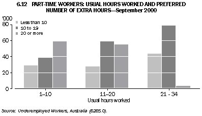 Graph 6.12 shows the usual hours worked and preferred number of extra hours of part-time workers. Of the persons who usually work between one and ten hours per week, almost half would like to work an extra 20 hours or more per week. For those persons usually working between 21 and 34 hours, the vast majority would prefer to work an extra 10 to 19 hours per week.