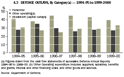 Defence spending has remained steady over the past decade, despite the end of the Cold War and a more fluid and uncertain strategic environment. As shown in graphs 4.1 and 4.2, although Defence outlays have risen gradually since 1994-95, as a percentage of GDP they declined from 1992-93 to 1996-97 before flattening out at about 2%. The White Paper Defence 2000 - Our Future Defence Force establishes that defending Australia in the 21st century will require a greater funding commitment than in the past. To that end, the Government has provided an increase in defence funding of $5.1b over four years, starting with a $507m increase in 2001-02. The military enhancements announced in the White Paper follow a major review of Australia’s defence requirements. Defence has been provided with a Capability Plan and funding projection for the development of Australia’s armed forces over the next decade. In all, defence spending over the next ten years is forecast to increase by a total of $27.6b, averaging around 3% per annum growth in real terms, bringing total spending over the period to around $160b. Graph 4.3 reflects the importance of people to Australia’s defence capability. It also shows an increased commitment to investment (capital outlays) in the late 1990s, which mainly comprises the purchase of specialist military equipment (the so-called ‘sharp end’ of defence). In the meantime, 'operating' expenditure has declined as a percentage of defence expenditure. Over the past decade, defence spending by Australia’s traditional strategic partners, the United States and the United Kingdom, has declined steadily with the end of the Cold War and the subsequent reduction of their military forces. The United States’ defence spending as a percentage of GDP has declined from 5% to 3%, and the United Kingdom’s spending as a percentage of GDP has dropped from 4% to 2.5%. Australia has spent less on defence as a percentage of GDP than either of these countries. From a regional perspective, Australia has tended to spend more on defence than its neighbours. Key regional players, such as Indonesia, Thailand, Malaysia, Singapore, the Philippines and New Zealand, all spend less than Australia. Table 4.4 compares Australia's defence spending with that by key South-East Asian countries during the 1990s.