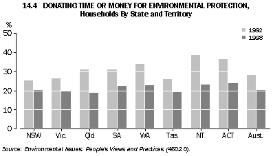 Australians who did not nominate the environment as their most important social issue were asked if they were concerned about environmental problems; in 1999 some 69% indicated that they were. The proportion of people expressing concern for the environment has declined slowly since 1992 (graph 14.3). People with higher incomes and more education are more likely to express concern for the environment (ABS 1996). However, higher household incomes can also increase environmental pressures because of the link between affluence and increased consumption of resources and waste production (Yencken and Wilkinson 2000). Donating time and money to environmental protection A study of the proportion of households donating time or money to environmental protection between 1992 and 1998 found an overall decline in the proportion in every State and Territory (graph 14.4). States and Territories that showed the largest falls were the Northern Territory (by 16%), the Australian Capital Territory (13%), Queensland (12%), and Western Australia (11%). New South Wales showed the smallest fall (5%) (Alle, Aravena and Henty 2001). The study also compared households located in the capital city of each State with those in the rest of the State (the comparison could not be done for households in the ACT and NT). It found that there were no large differences, in 1992 or 1998, in the proportions of households in the two categories donating time or money (graphs 14.5 and 14.6). Household waste management Household recycling Household solid waste is defined as waste from domestic premises; it includes household refuse, garden waste and other discarded materials, such as disused furniture. An important response to household waste is recycling. Household recycling has increased in Australia during the nineties: in 1992 around 85% of people recycled some items of waste; by 2000 this had risen to about 97%. Paper, old clothing, plastic bags and glass were the items most commonly recycled (graph 14.7). Only a small proportion of Australian households (just under 7% in March 2000) recycle all the waste items that can be recycled. While recycling rates have improved, more household waste still goes to landfill than is recycled; an audit in 1997 found that the average Australian household produced 15.7 kg of waste for collection each week (Beverage Industry Environment Council 1997). This comprised 11.9 kg of garbage, 3.1 kg of recyclables, 0.2 kg of contaminants and 0.5 kg of green waste. Recycling behaviour in Australia is different for different types of households. For example, one person households recycle less than all other types of households (graph 14.8). The most common reason provided by the 93% of Australian households that did not fully recycle in 2000 was a lack of recyclable materials in their waste (around 73% of the households not fully recycling). The next most common reason cited by households was the absence of recycling services or facilities; households from the Northern Territory were the most likely to select this reason for not fully recycling (graph 14.9). Only a small proportion of households (around 3%) in Australia recycled no waste items at all in 2000; this proportion has fallen in every State and Territory since 1992 (graph 14.10). National targets for minimisation of solid waste While recycling of solid waste by households is important, waste minimisation by all sectors has been seen by policy makers as the key to reducing the environmental pressures arising from solid waste going to landfill. In 1990 the Australian and New Zealand Environment and Conservation Council set a national target of a 50% reduction in waste going to landfill by the year 2000, based on 1990 per capita levels. This target has not been met, and it is possible that the levels of waste going to landfill have not been reduced at all (the uncertainty stems from a lack of consistent national data) (Chalkley Consulting and Global Environmental Consulting 2000). Estimates of household waste produced in Australia in the early nineties were around 400 kg per person per year (OECD 1999). Total solid waste going to landfill in Australia in 1996-97, however, was around 1,100 kg per person per year (total solid waste includes waste associated with councils servicing residential areas as well as commercial, industrial, construction and demolition waste) (ABS 1998). As the construction and demolition industries are thought to generate up to 40% of all solid waste going to landfill in Australia, businesses in these industries, in partnership with government, have initiated and funded their own improvements to solid waste management (Environment Australia 2000). Assessing the performance of the household sector in waste minimisation remains problematic. Household hazardous waste Households accumulate hazardous waste, such as garden chemicals and paint products. In 2000 a smaller proportion of households (21%) took their household hazardous waste to a dump or central collection point than in 1996 (30% of households). This decline was despite an increase in households' awareness of the availability of facilities in their area for the safe disposal of household hazardous waste (37% awareness in 2000 compared to 31% in 1996).