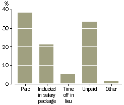 In 2000, around 2.5 million employees (33%) regularly worked overtime in their main job. At least two-thirds of these employees had been, or expected to be, reimbursed in some way for the most recent period of overtime that they worked; 38% by extra pay, 21% by inclusion of overtime in their salary package, 5% by receiving time off work in lieu of payment, and 2% by other means. One-third of all employees who usually worked overtime were not, or did not expect to be, reimbursed by any of these methods for the most recent period of overtime that they worked.