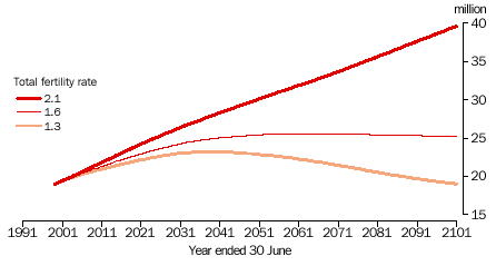 This article explores the possible impact on the Australian population of three very different fertility scenarios. Each scenario assumes that fertility reaches a certain rate in 2008-09 and remains constant at this level until 2101. Under the lowest fertility scenario, this rate is 1.3 babies per woman, a level already realised in some countries. The middle level scenario assumes a total fertility rate of 1.6. The third scenario, at a high level of 2.1 babies per woman, represents replacement level fertility. Migration and mortality, the other two factors affecting population growth, are held at the same level for all scenarios. Net overseas migration is assumed to be 90,000 per year, while life expectancy at birth is assumed to rise to 83.3 years for males and 86.6 years for females in 2051, then remaining constant until 2101.
