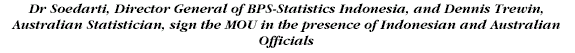 A major development in 2000-01 was the signing of an updated Memorandum of Understanding (MOU) with the Indonesian statistical agency, BPS-Statistics Indonesia (BPS) on ABS-BPS cooperation. The updated MOU reflects the new and continuing statistical priorities which the BPS will need to address to assist policy development and planning in Indonesia.