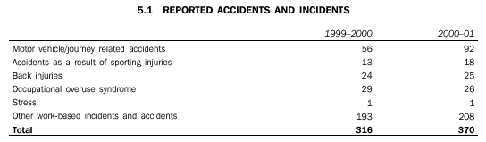 There were 370 reported accidents and incidents in 2000-01 (compared with 316 in 1999-2000). The reported accidents fall into the following broad categories:
