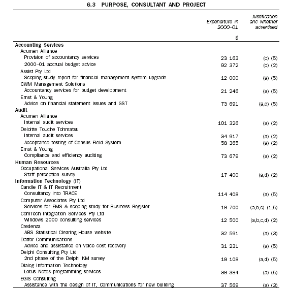 Consultants engaged in 2000-01 are listed in the following table. The project for which each was engaged and the expenditure in 2000-01 are also shown. The consultants are listed under the main purpose for which they were engaged. The justification for recourse to consultancy arrangements, and the type of tender used, is indicated in each case by an alphabetic and a numeric symbol, which is explained in a key at the end of the table.