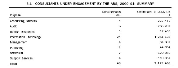 The purposes for which consultants were engaged by the ABS in 2000-01 have been classified into nine main categories. These are shown in the table below. In all categories, the predominant reasons for the use of consultancy services were the need for specialised skills and to allow efficiency and flexibility in operations by making additional personnel available.