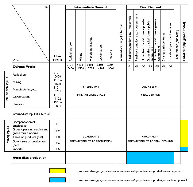 9.23 The basic structure of an industry-by-industry table with direct allocation of imports is shown in table 9.1. The notation of rows and columns is that used in Australian National Accounts: Input-Output Tables (Cat. no. 5209.0). Flows between domestic industries are shown in Quadrant 1 (rows and columns 0101 to 9601). This is usually referred to as the inter-industry quadrant. Each column in this quadrant shows the intermediate inputs into an industry in the form of goods and services produced by other industries, and each row shows those parts of an industry's output which have been absorbed by other industries. For example, the cell at the intersection of row i and column j shows how much output of industry i has been absorbed by industry j for current production. Disposition of output to categories of final demand is shown in Quadrant 2, comprising rows 0101 to 9601 and columns Q1 to Q7. Quadrant 3 (rows P1 to P5 and columns 0101 to 9601) shows entries usually referred to as primary inputs: compensation of employees; gross operating surplus and gross mixed income; imports; and various types of taxes on production. These inputs differ from the intermediate inputs in that they are not part of the output of current domestic production.