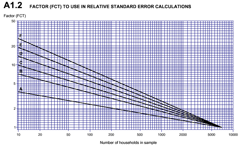 RSE = FCT * R% where R = the relative standard error of the estimate for Australia and is given in table A1.1 or A3.1; and FCT = a factor based on the number of sampled households and is given in graph A1.2.