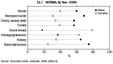 As table 11.6 shows, assault is the most common category of offences recorded against the person; police recorded 141,124 victims of assault during 2000, representing a victimisation rate of 737 victims per 100,000 persons. There were 15,630 cases of sexual assault recorded, a rate of 82 victims per 100,000 persons, and 302 victims of murder, a rate of 1.6 victims per 100,000 persons.