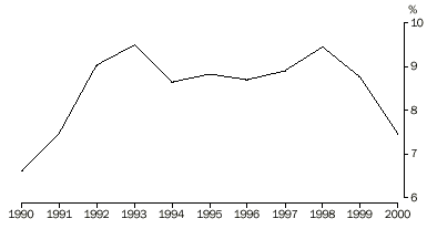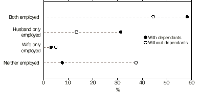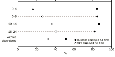 Note: The Labour Force Survey product set is changing in 2003. AUSTRALIAN FAMILIES COUPLE FAMILIES In June 2000, 77% of couple families had at least one partner employed. This proportion has risen from 75% in June 1993. The proportion in June 1990 was 78%. The proportion of couple families with both partners employed has risen from 49% in June 1990 to 51% in June 2000. The percentage of couple families where one partner was employed and the other was not in the labour force has decreased from 27% in June 1990 to 23% in June 2000. COUPLE FAMILIES: EMPLOYMENT STATUS OF PARTNER/S AND WHETHER DEPENDANTS PRESENT COUPLE FAMILIES WITH DEPENDANTS PRESENT The proportion of couple families with dependants present in which one or both partners were employed was 93% in June 2000, the same as June 1990. The husband was employed in 89% of all couple families with dependants. This proportion has been steady in recent years. In 95% of these cases, the husband was employed full time. The wife was employed in 61% of couple families with dependants. The proportion where the wife was employed full time has risen from 20% in the early 1980s to 26% in June 2000. The percentage of wives employed part time was 35% in June 2000. This percentage has been relatively steady at around 34% between June 1995 and June 1999, after rising slowly from around 25% in the early 1980’s. The proportion of wives in full-time employment rose as the age of the youngest dependant increased, as shown in the following graph. COUPLE FAMILIES: FULL-TIME EMPLOYMENT STATUS OF PARENT BY AGE OF YOUNGEST DEPENDANT In 2.9% of couple families with dependants present (57,900 families) the husband was unemployed and the wife was either unemployed or not in the labour force. In 41% of these families, the husband had been unemployed for 52 weeks or more. This proportion has fallen from 45% in June 1999. The percentage of couple families with dependants present with one or both parents unemployed was 6.5% in June 2000. This proportion is unchanged from June 1999, but has fallen 1.2 percentage points since June 1998. The proportion of these families with one or both partners unemployed generally reflects changes in the overall level of unemployment. The number of children aged 0-14 in couple families where neither parent was employed was 265,700 in June 2000. COUPLE FAMILIES WITHOUT DEPENDANTS PRESENT In June 2000, 53% of couple families had no dependants present. The proportion has been consistently greater than 50% since June 1994. COUPLE FAMILIES The husband and wife were both aged 45 years or over in 72% of couple families without dependants present in June 2000, a decrease from 73% in 1999. Of these, 49% were families where both partners were not in the labour force. At least one partner was employed in 63% of couple families without dependants present and 44% had both partners employed. The husband was employed full time in 51% of couple families without dependants and the wife was employed full time in 32%. In these families, the proportion in which wives were employed part time has risen from 14% in June 1993 to 17% in June 2000, although it has remained steady over the last 2 years. Over time, the proportion where at least one partner was unemployed broadly reflects movements in the overall level of unemployment. In June 2000, this proportion was 3.3% for these families (compared with 6.5% for couple families with dependants present). ONE PARENT FAMILIES In June 2000, there were 770,300 one parent families, making up 15% of all families. This proportion has increased from 13% in June 1994. ONE PARENT FAMILIES: EMPLOYMENT STATUS OF PARENT BY AGE OF YOUNGEST DEPENDANT The percentage of one parent families where the parent was not in the labour force decreased to 46% in June 2000 from 51% in June 1994. The parent was unemployed in 6.3% (48,500) of one parent families. In 13,900 or 29% of these families, the parent had been unemployed for 52 weeks or more. ONE PARENT FAMILIES WITH DEPENDANTS PRESENT In June 2000, there were 549,100 one parent families with dependants present, 71% of all one parent families. Of these, 86% had a female parent. In 58% of one parent families with dependants the youngest child was aged 0-9 years. The parent was employed in 51% of one parent families with dependants present in June 2000, an increase from 46% in June 1998. Male parents were employed in 64% of these families, compared with 49% of those with a female parent. The proportion with the parent employed generally increased as the age of the youngest dependant increased, with 70% of one parent families whose youngest dependant was aged 15-24 years having an employed parent, compared to 30% whose youngest dependant was aged 0-4. The percentage of one parent families with dependants present where the parent was unemployed has decreased to 7.5% in June 2000. The proportion peaked at 9.5% in June 1993 before falling to 8.6% and remained relatively steady for the next three years. It rose to 9.4% in June 1998 before falling again. ONE PARENT FAMILIES WITH DEPENDANTS: PARENT UNEMPLOYED The number of children aged 0-14 in one parent families where the parent was not employed fell by 9% over the last year, to 411,100 in June 2000. The level, however, remains 17% higher than in June 1993. PERSONS WHO WERE NOT MEMBERS OF A FAMILY Persons living alone accounted for 12% (1,672,200) of the population where relationship in household was determined in June 2000. Some characteristics of these persons were:
